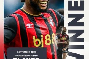 体育资讯10月13日讯 PFA(英格兰职业球员工会,Professional Footballers' Association)官方宣布,伯恩茅斯边锋塞梅尼奥当选球迷票选英超9月最佳球员。