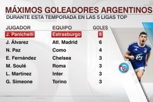 体育资讯10月27日讯 ESPN统计了阿根廷球员在本赛季五大联赛中的进球数量,并列出五大联赛阿根廷球员射手榜,斯特拉斯堡大中锋帕尼切利8球居首。