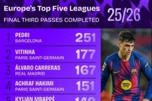 体育资讯10月1日讯 数据网站Squawka统计本赛季五大联赛进攻三区完成传球数,巴萨中场佩德里断档领先,皇马4人进入前十。