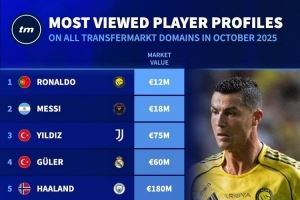 体育资讯11月2日讯 德国转会市场列出了10月份球员页面浏览量排名,C罗居首,梅西、伊尔迪兹二三位。